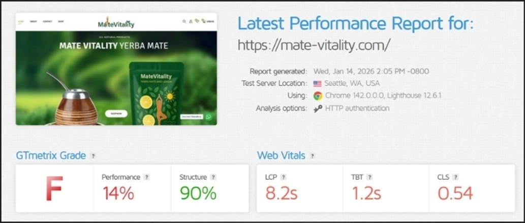 Performance Was Critical: GTmetrix rated the site an F with a 14% performance score. The page took 8.2 seconds to load its main content long enough for most visitors to leave before seeing a single product. Total Blocking Time was 1.2 seconds and the layout was visibly shifting as the page loaded, creating a poor and unreliable experience for every visitor.