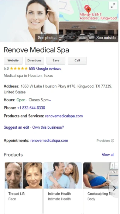 Houston and the Kingwood area have multiple med spas competing for the same local search terms. Rénove was not appearing consistently for high-intent searches like “med spa Kingwood” or “Botox near me Houston” meaning potential patients were landing on competitors first.